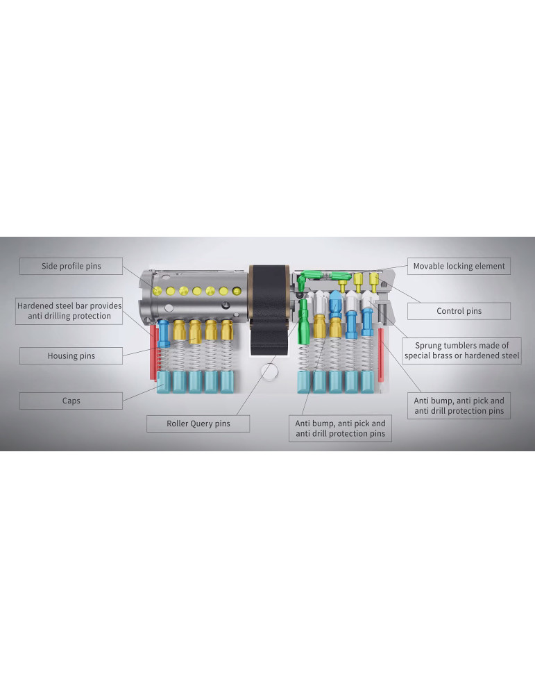 - Ισχυρή προστασία αντιγραφής, που προσφέρει η πολυπλοκότητα του συστήματος στοιχείων του roller στη λεπίδα του κλειδιού, καθώς και των επιπλέον pins, για περισσότερα επίπεδα ασφαλείας.